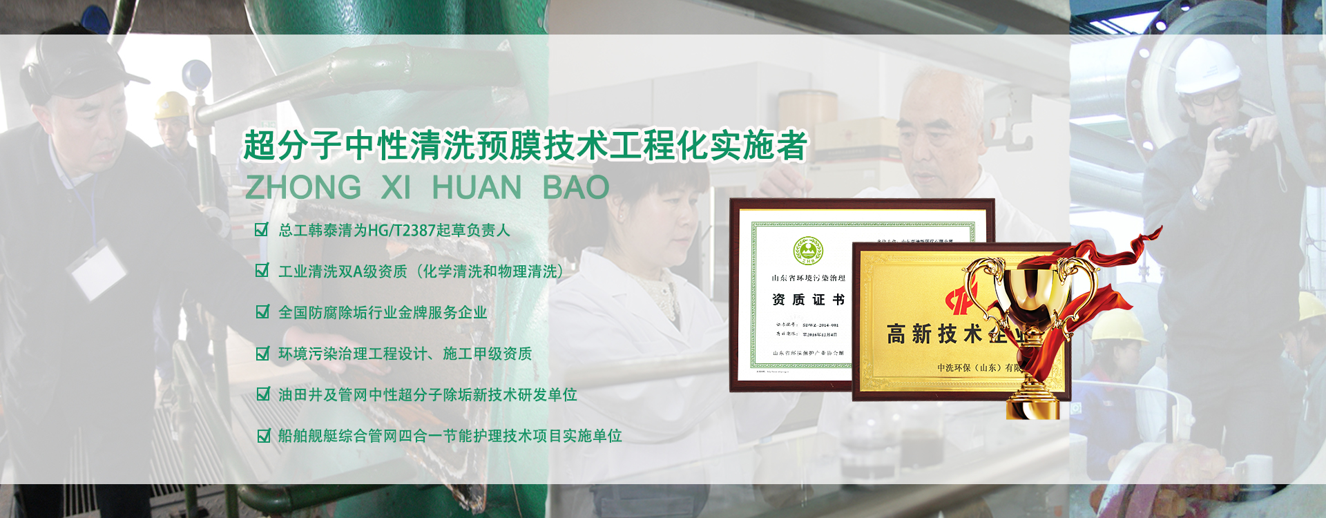 诚信务实,创新共赢!节能减排,造福社会! 中洗环保是集研发、生产、工程服务于一体的实业公司,厂址位于国家级新材料产业基地——青岛市青大工业园,诚邀国内外防腐清洗、水处理从业者加盟,合作共赢。公司创始人之一韩泰清是原化工部防腐清洗专家,从事防腐清洗水处理工作40多年,是国家认可委唯一的化学清洗专家,是HG/T2387-1992《工业设备化学清洗质量标准》起草负责人,该标准现已变更为国家标准GB/T25146-2010《工业设备化学清洗质量验收规范》。公司主营各种清洗剂、缓蚀剂、缓蚀阻垢剂、杀菌灭藻剂、解堵剂、解聚剂、絮凝剂、脱水剂、清洗工程、油田解堵增产服务、循环水零排放服务和EPC合同能源管理服务等,自主研发的超分子节能减排技术系列专利,改变了传统的水处理和防腐清洗模式。突出特色技···